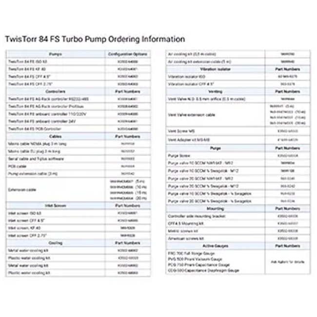 Bơm Turbo Agilent 80 L/s, TwisTorr 84 FS tích hợp công nghệ TwisTorr drag stage và Agilent Floating suspension(FS) để mang lại hiệu suất cao, độ tin cậy và kinh tế. Máy bơm Tubi 80L/s mang tới hiệu suất chân không cao nhờ vào sự kết hợp của công nghệ Turbo và TwisTorr tiên tiến. Công nghệ FS đảm bảo làm giàm độ rung và tiếng ồn nhắm tương thích với thiết bị đo dạc và môi trường làm việc.