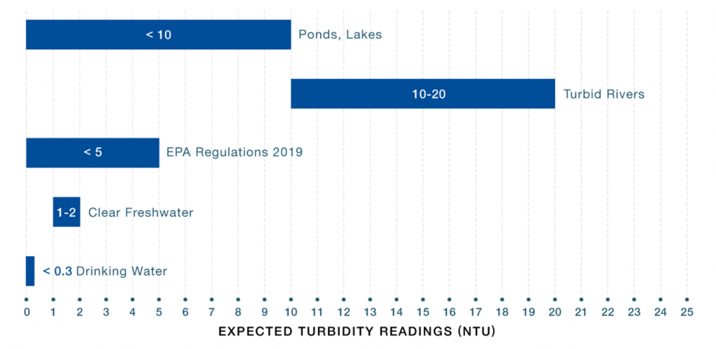 Biểu đồ dưới đây thể hiện giá trị độ đục (NTU) thường gặp đối với các nguồn nước khác nhau: