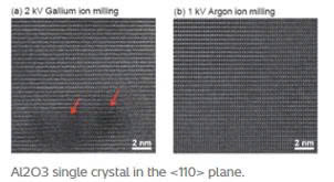 Hình ảnh bên phải chỉ thấy cấu trúc đơn tinh thể tương tự vẫn còn nguyên vẹn sau khi cắt bằng ion Ar 1 kV làm lộ rõ các vân mạng tinh thể sắc nét.