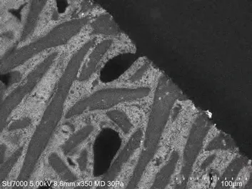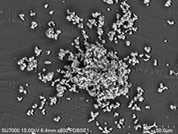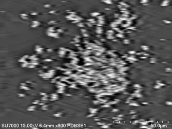 Năm hình ảnh từ đầu dò (UD, LD, UVD, MD, và PD-BSED) cùng với Bản đồ SEM (SEM MAP) của các tạp chất phi kim loại trong mẫu thép được hiển thị (bên trái).