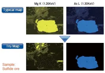Trong ví dụ minh họa bên dưới, dữ liệu từ Mg-K và As-L có các đỉnh chồng chéo trong các bản đồ thông thường, được phân giải rõ ràng và không bị chồng chéo tín hiệu khi sử dụng chức năng TruMap.