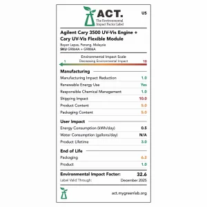 • Chọn tính bền vững: Cary 3500 Flexible UV-Vis đã nhận được nhãn ACT (Trách nhiệm giải trình, Tính nhất quán, Minh bạch) của My Green Lab sau khi kiểm toán độc lập về tác động môi trường trong suốt vòng đời sản phẩm. Hệ thống đã giành giải thưởng Sản phẩm bền vững của năm 2023 từ SelectScience.