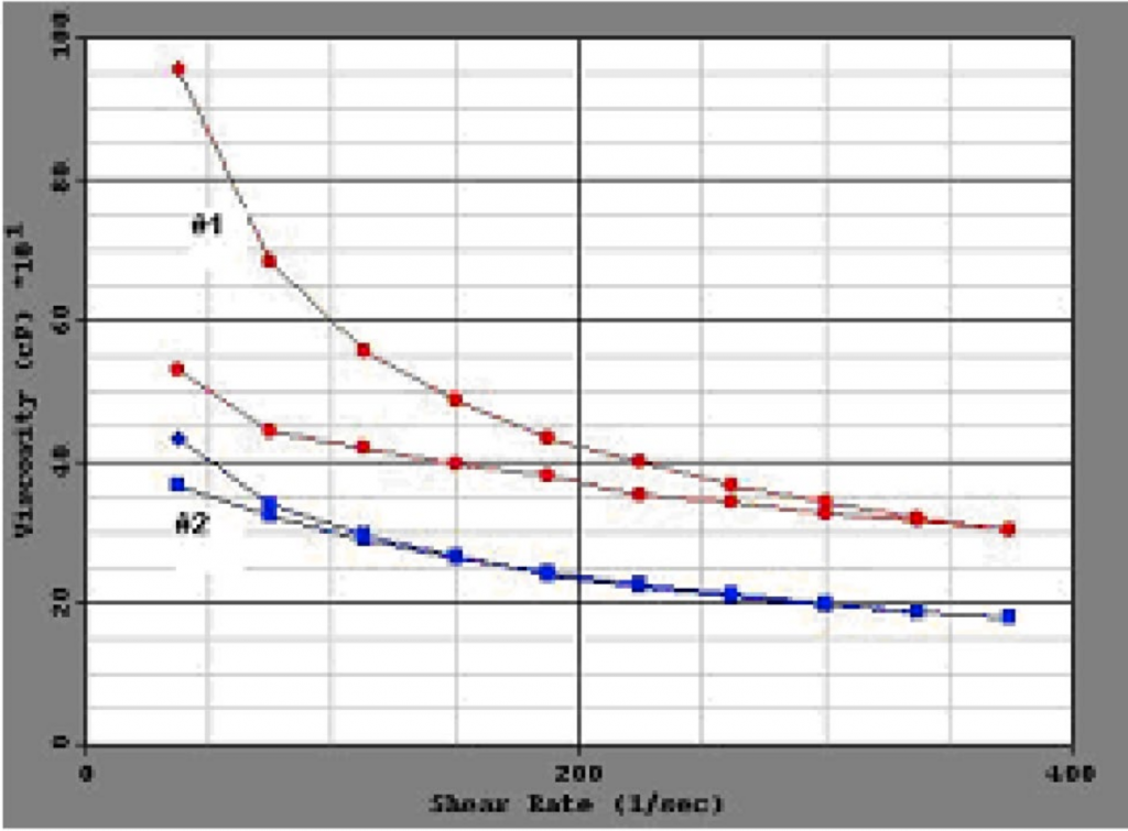 ○ Mẫu #1 cho thấy sự giảm độ nhớt đáng kể do lực cắt (thể hiện tính biến đổi theo thời gian cao), trong khi Mẫu #2 chỉ cho thấy sự giảm độ nhớt nhẹ.