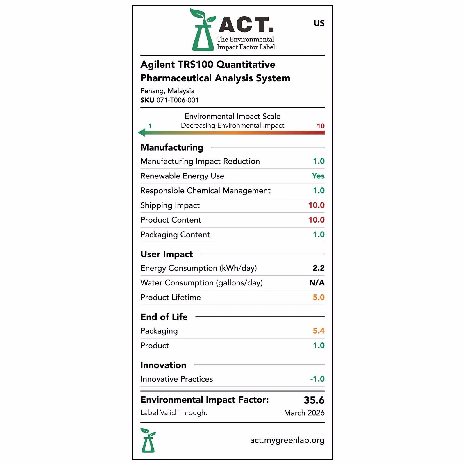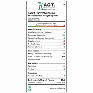 - Chọn tính bền vững: Cary 60 UV-Vis đã nhận được nhãn ACT (Trách nhiệm giải trình, Tính nhất quán, Tính minh bạch) của My Green Lab sau khi được kiểm toán độc lập về tác động môi trường trong suốt vòng đời sản phẩm.